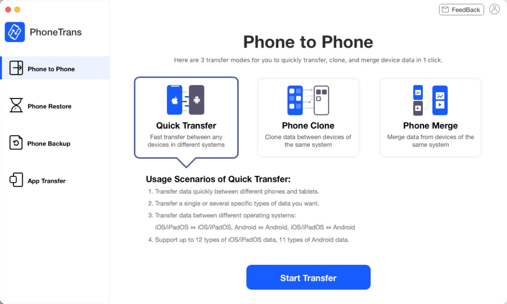 • Download PhoneTrans and connect both iPhones. Select Phone to Phone.