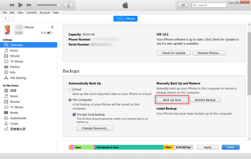 • Backup old iPhone: Connect the old iPhone to the computer, open iTunes, select the device, go to Summary > Back Up Now.