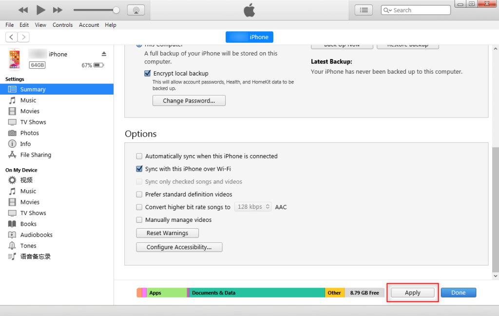 • Select the device, go to Summary, and enable Sync with this iPhone over WiFi.